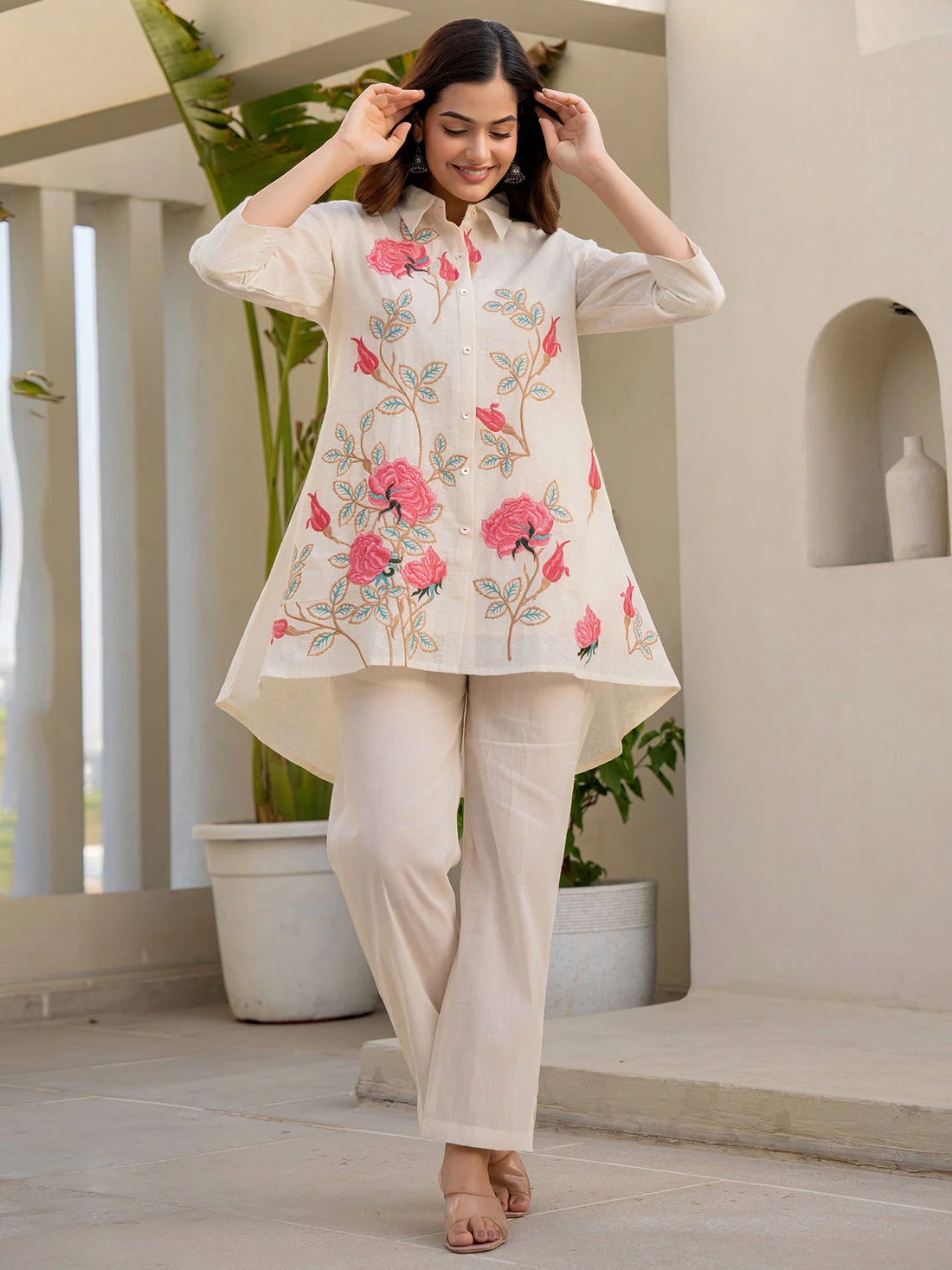 Off White Embroidered Pure Cotton A-Line Kurta Trouser Set