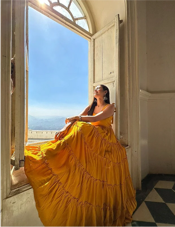 Mustard Embroidered Chanderi Silk A-Line Kurta Trouser Set