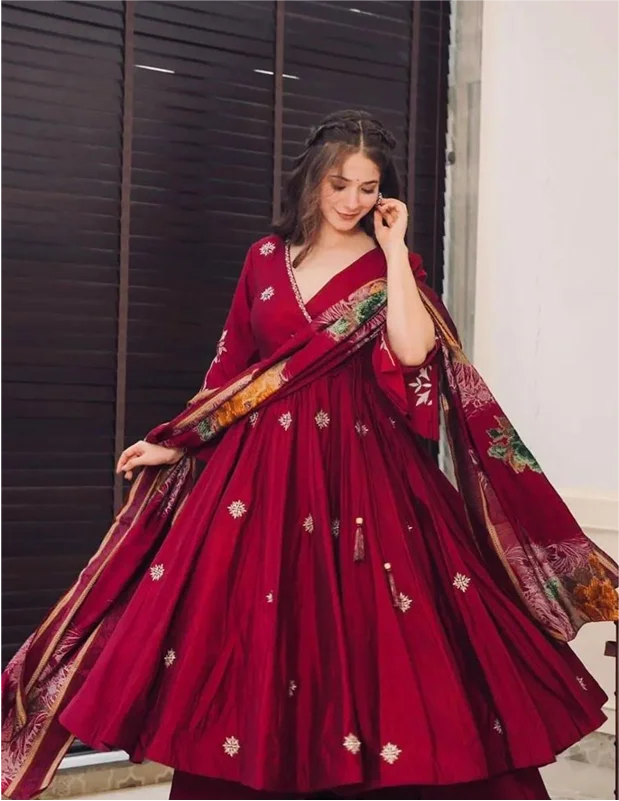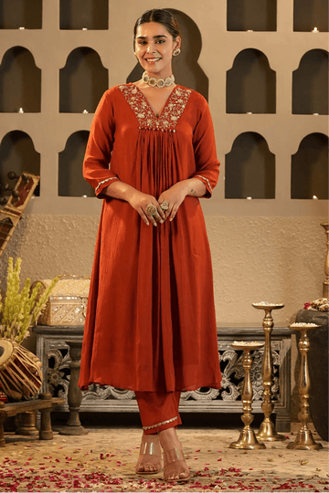 Rust Embroidered Chanderi Silk A-Line Kurta Trouser Set