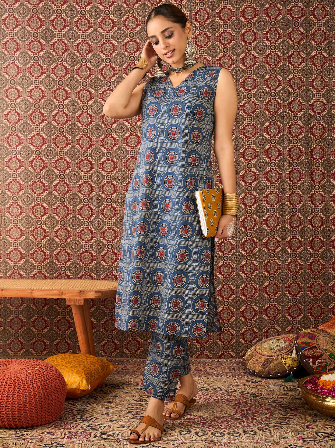 Blue Printed Pure Cotton Straight Kurta Trouser Set