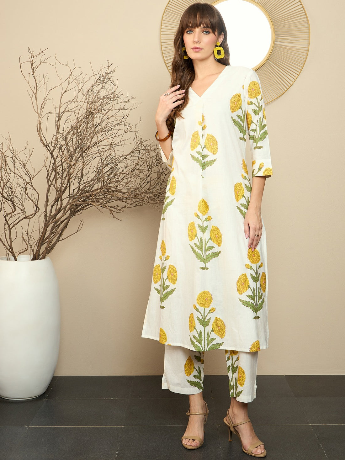 Effortlessly elegant, this off-white printed A-line kurta set is perfect for both work and casual...