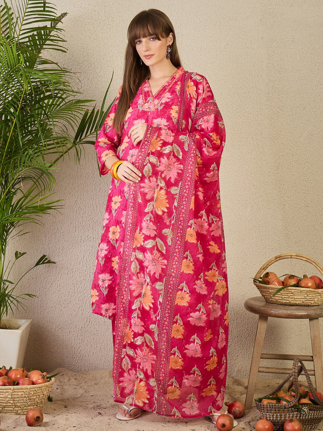 Pink Printed Pure Cotton A-Line Kurta Sets With Dupatta