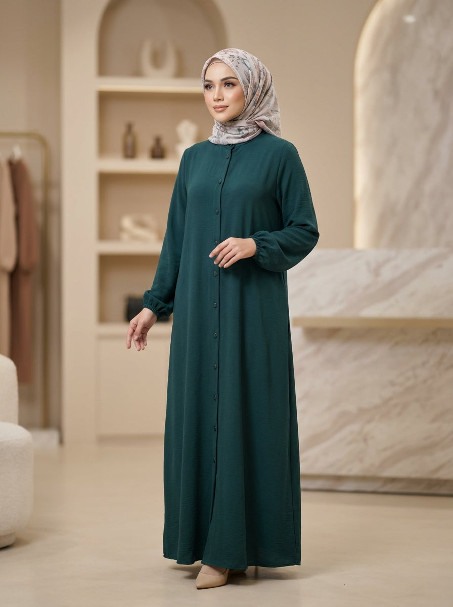 Front-Open Versatility: Features a full-length front opening—usually secured with high-quality snap buttons or a concealed zipper—allowing you to wear it as a closed abaya or an open duster coat.