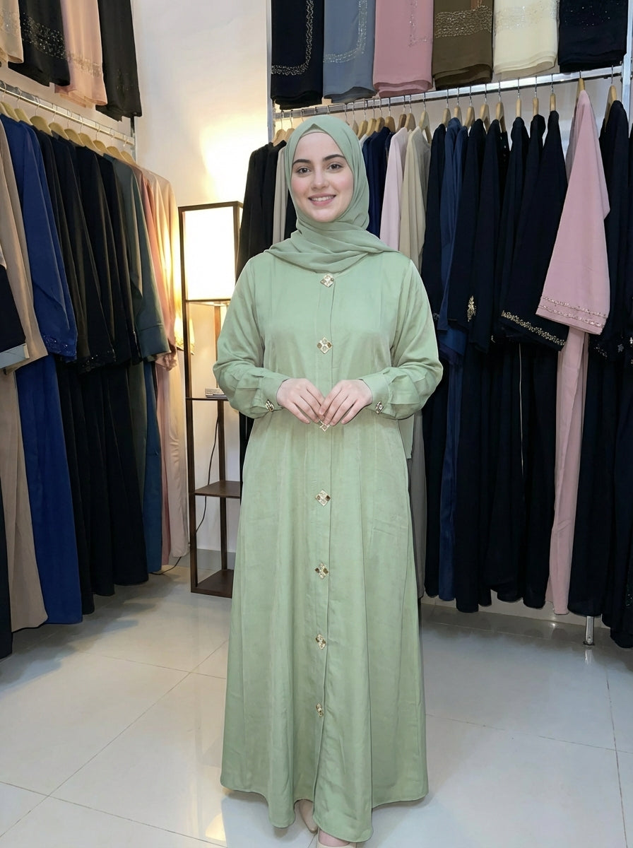 Signature Button Pattern: The centerpiece of this Burqa is the exquisite vertical pattern of imported decorative buttons. These aren't just fasteners; they are intricately designed accents that add a touch of metallic or jewel-toned luster to the front placket.